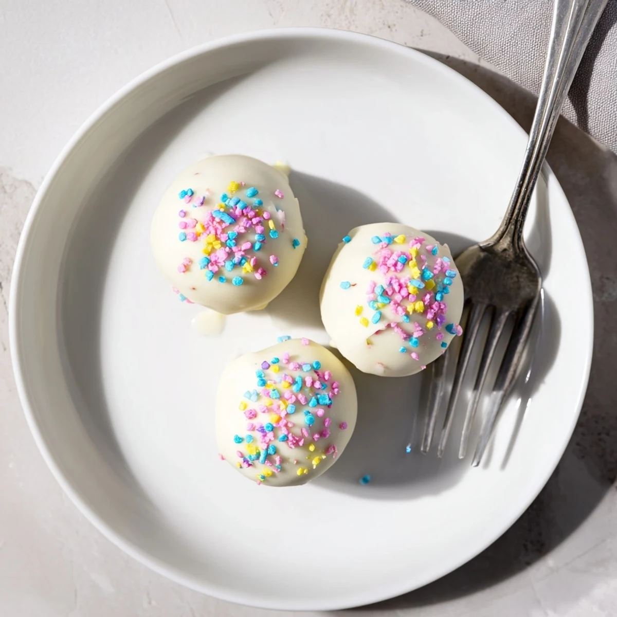 - Dip each chilled truffle into the melted chocolate, let excess drip off, then immediately add Easter sprinkles before the coating sets.