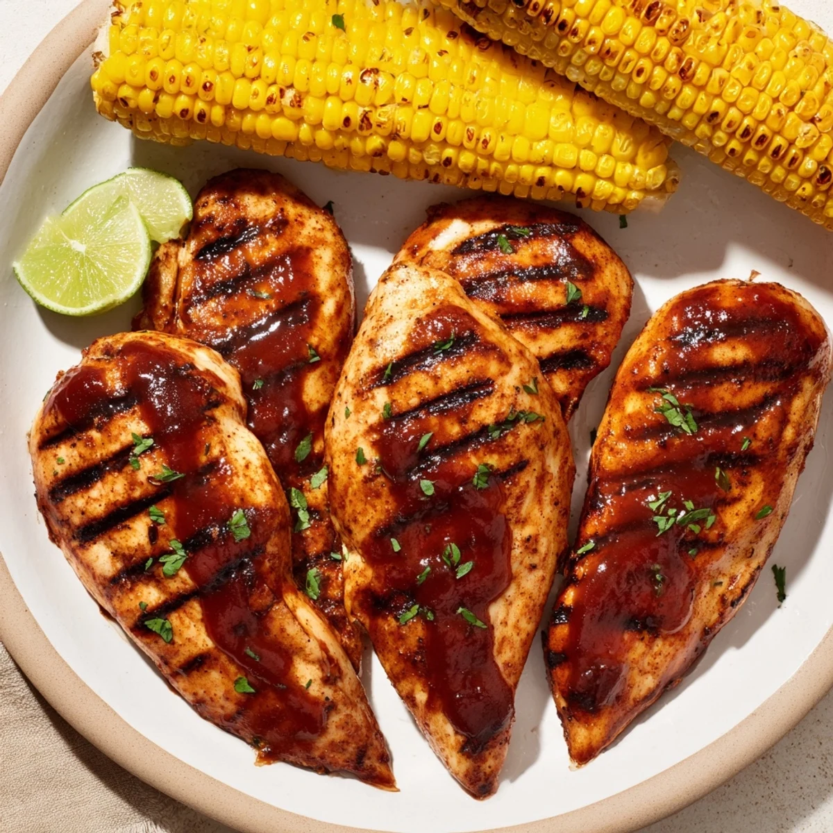 Season boneless chicken breasts with smoked paprika, garlic and onion powders, oil, salt and pepper. Grill over medium-high heat (about 200°C/400°F) roughly 6–7 minutes per side, basting with barbecue sauce during the final minutes. Grill buttered corn until charred and tender, then rest chicken 5 minutes before slicing. Total time ~45 minutes; finish with parsley and lime for brightness.