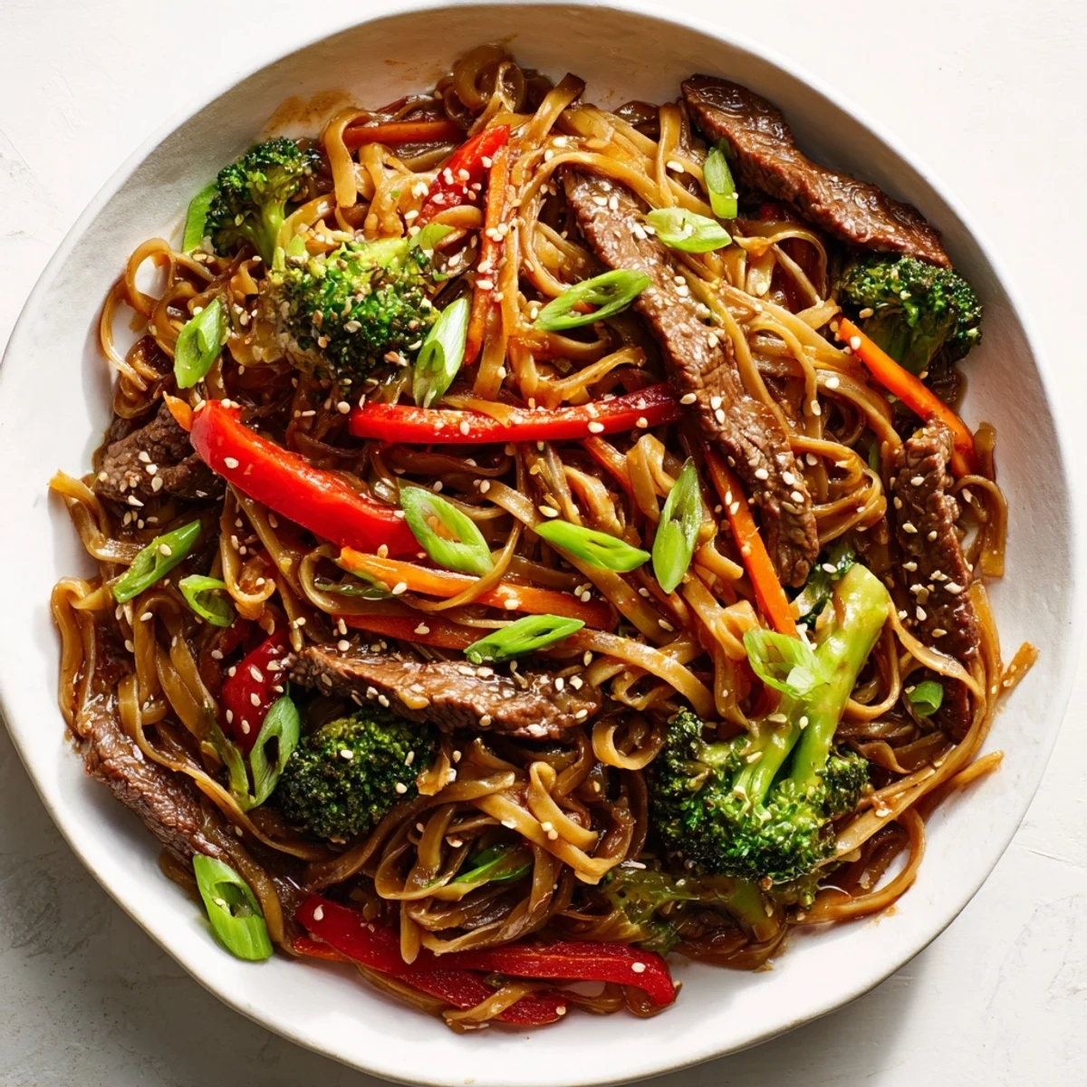 - Return the beef, add noodles and green onions, pour in the sauce, and toss until everything is glossy and coated in that incredible sesame soy glaze