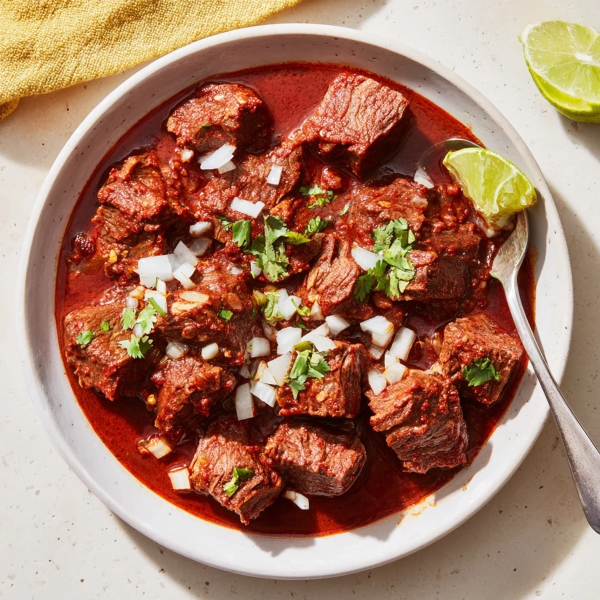 This traditional Mexican stew transforms tough beef chuck into fork-tender meat through slow cooking in a vibrant red chili sauce. Dried guajillo and ancho chiles create a deep, complex flavor profile with hints of smokiness and earthiness. The beef simmers for hours, absorbing the spiced sauce until it becomes incredibly tender and succulent. Serve with warm tortillas, fresh cilantro, and a squeeze of lime for a complete meal that brings authentic Mexican flavors to your table with minimal effort.