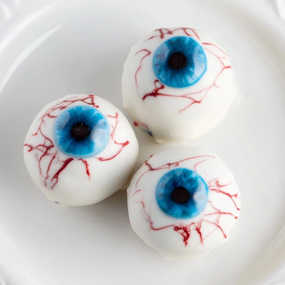 - Once the irises set, add a dark chocolate dot for the pupil. Draw red veins around the edges with decorating gel.