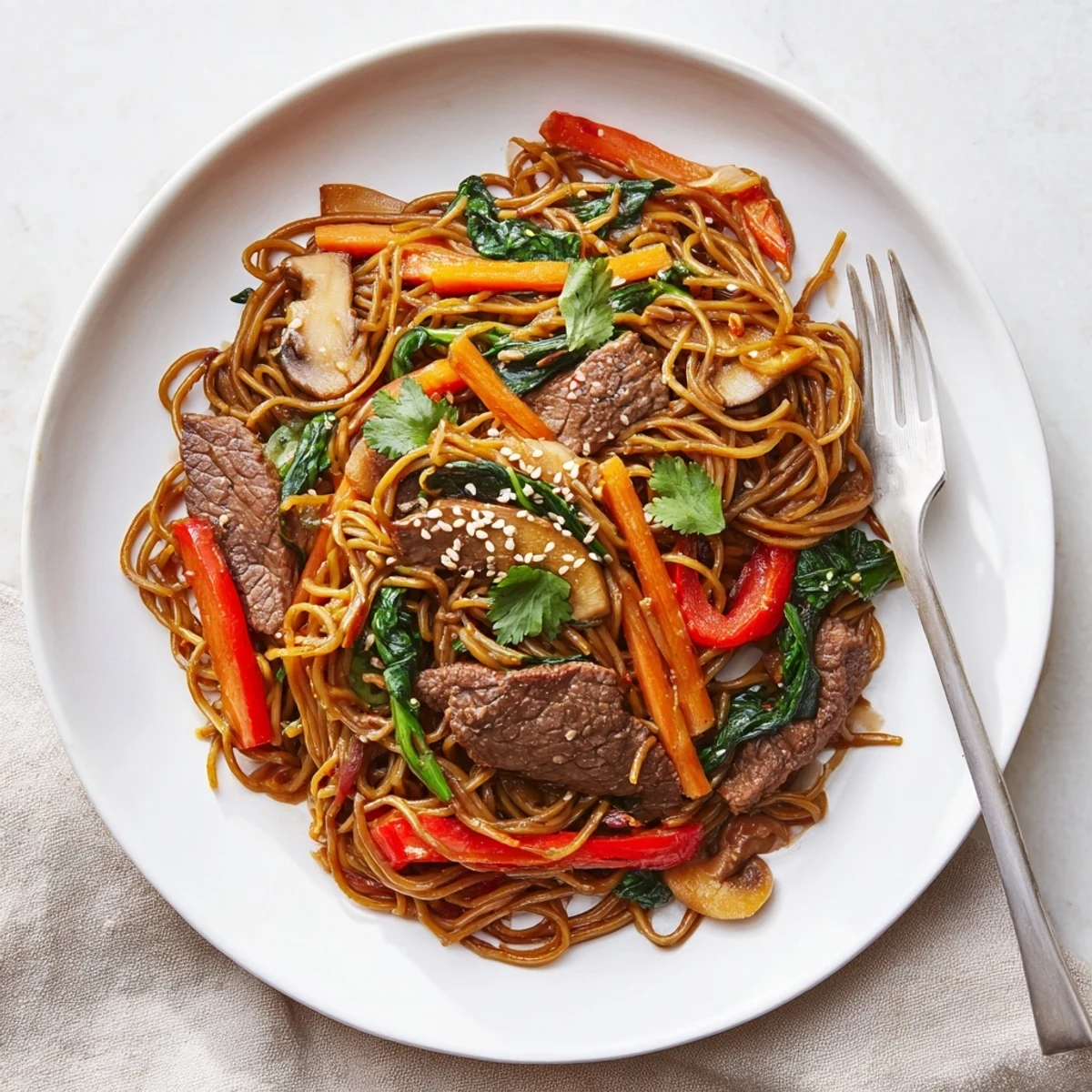 This dish brings together tender marinated beef, crisp colorful vegetables, and chewy sweet potato noodles coated in a rich Korean-inspired sauce. The balance of savory soy, sweet brown sugar, and spicy gochujang creates depth and complexity.