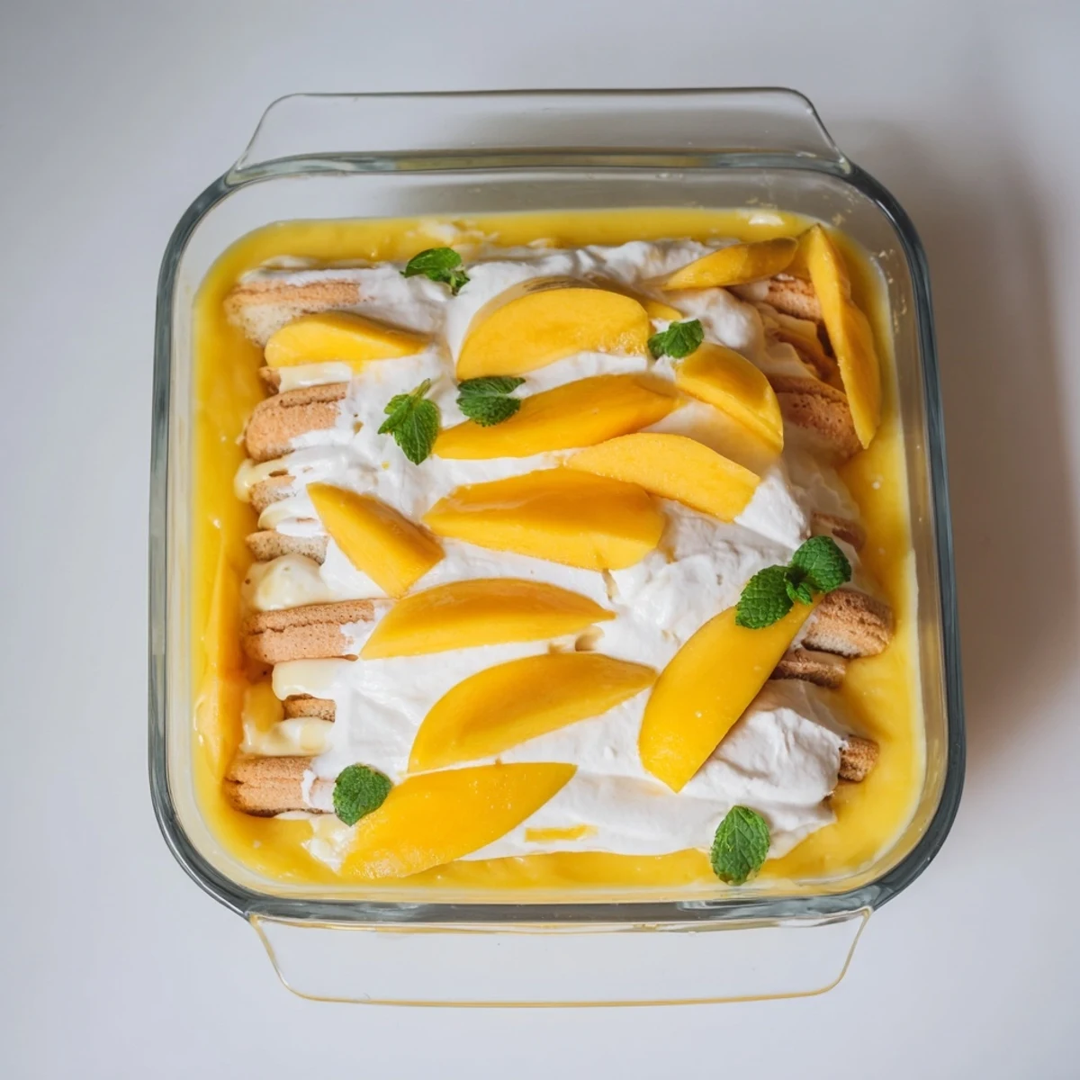 Individual glasses look impressive and let everyone see those beautiful layers, but a classic 8x8 baking dish works perfectly for family style. Glass dishes show off the mango and cream pattern, but honestly it tastes just as good from a simple ceramic pan.
