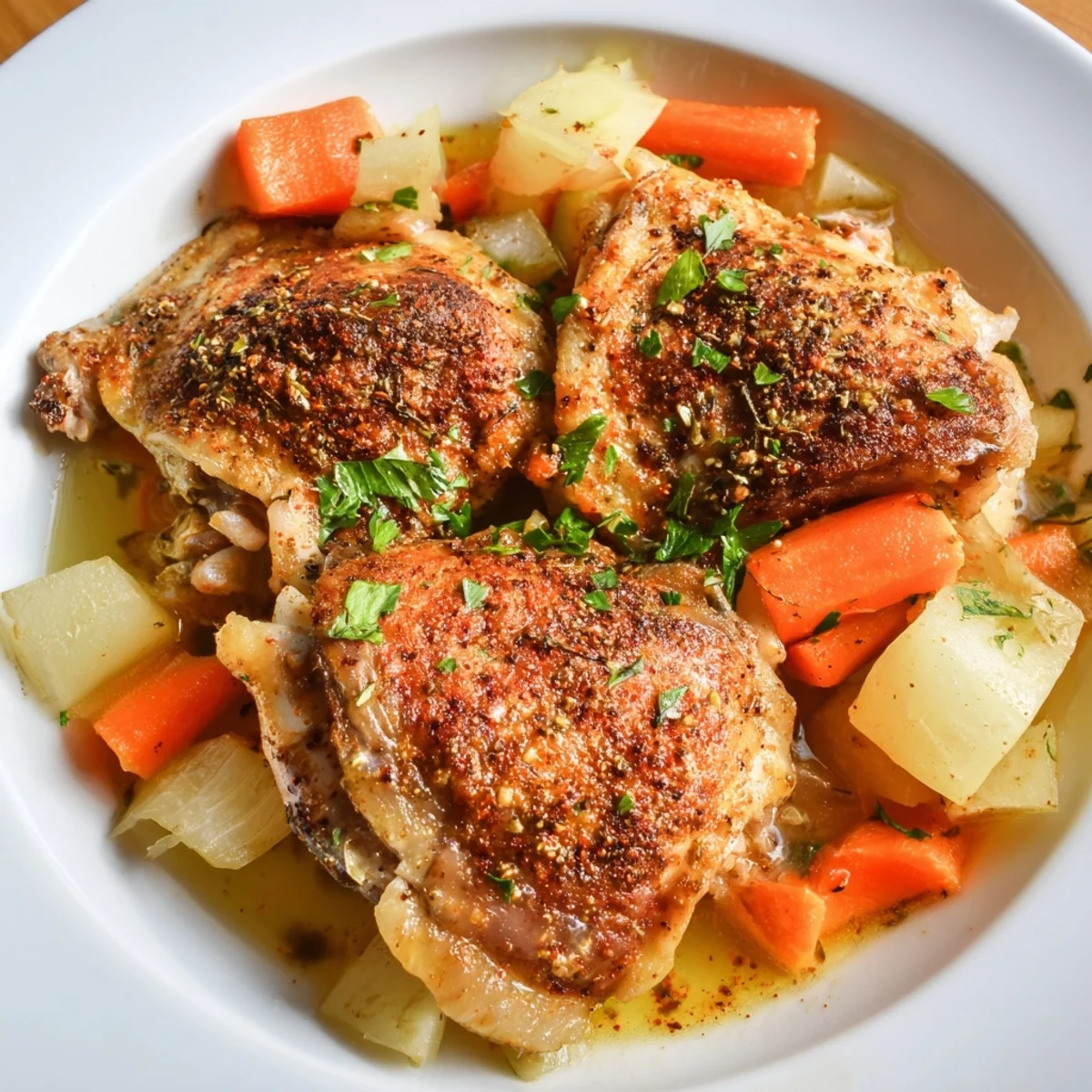 Transform simple ingredients into a comforting meal with minimal effort. Season chicken thighs with aromatic herbs, briefly sear for depth, then layer with chunky vegetables in your slow cooker. Six hours later, enjoy tender, falling-off-the-bone chicken bathed in savory broth with perfectly cooked carrots and potatoes. This hands-free dinner delivers rich flavors and satisfying textures while you go about your day.