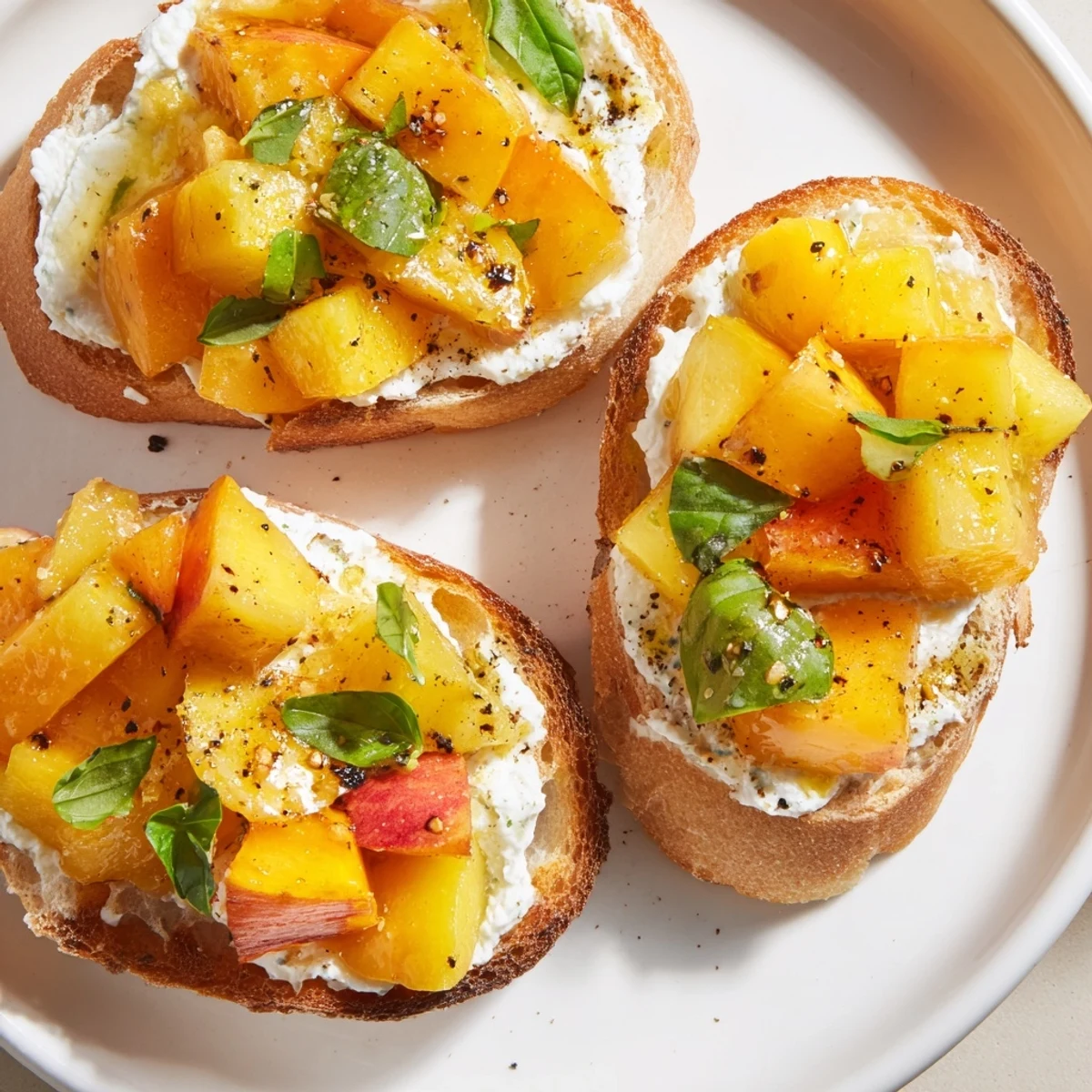 This refreshing summer appetizer combines sun-ripened peaches with creamy ricotta cheese and aromatic basil, all served atop golden toasted baguette rounds. The balance of sweet honey-tossed fruit, rich cheese, and crisp bread creates perfect bites for warm weather gatherings.
